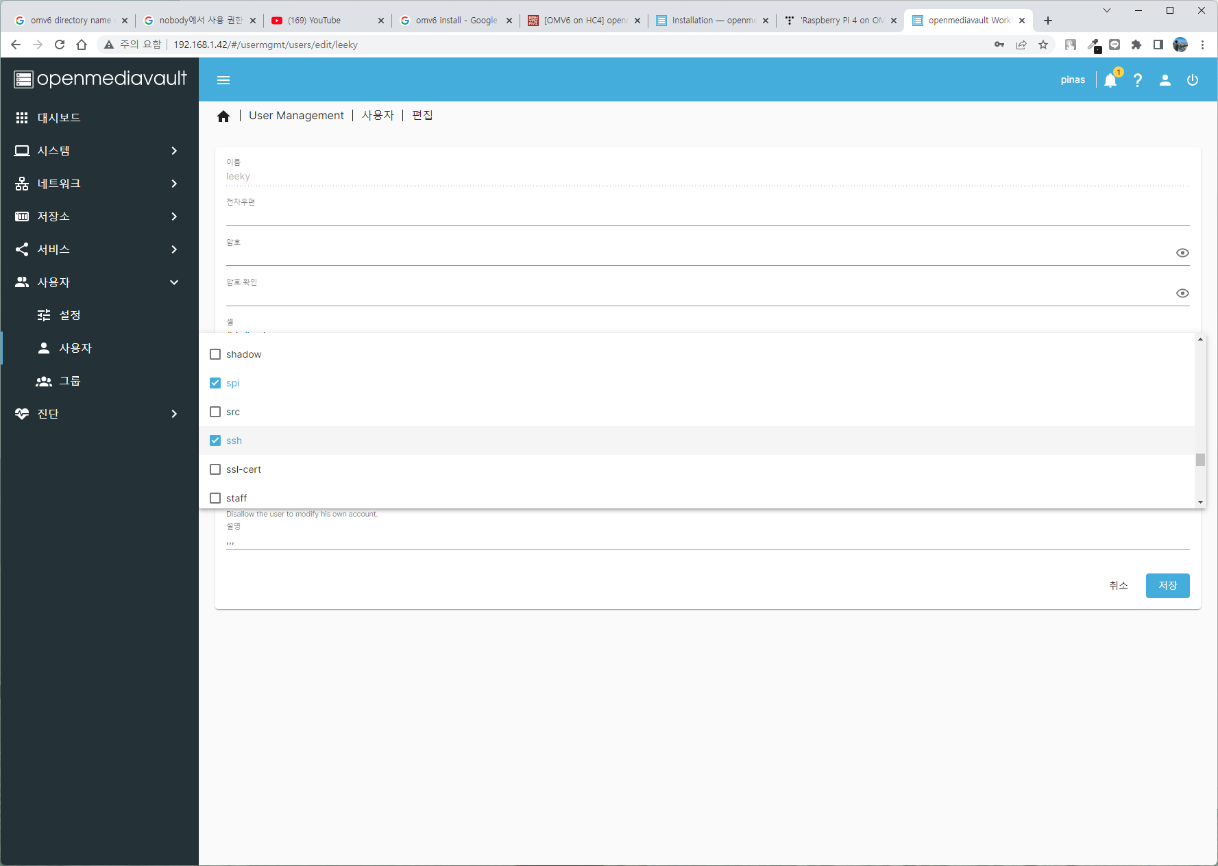 8. 참고로 OMV를 설치하고 난 후에는 SSH에 접속이 되지 않는다. 서비스 항목을 보면 SSH가 활성화가 이미 되어 있다고 돼 있는데도 접속이 안되는데 이럴땐 사용자 설정에서 SSH 그룹을 추가해주면 된다.