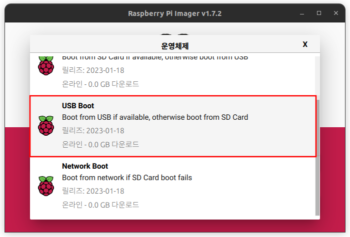 step 2) 운영체제 - Misc utility images - Bootloader(Pi 4 family) 5 시리즈를 갖고 있다면 Pi 5 family 선택 - USB Boot